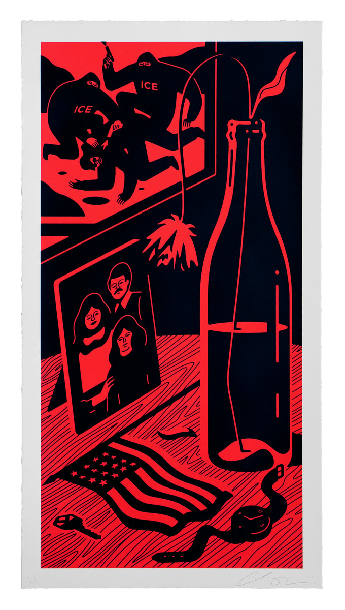 In the foreground, a table holds a family photograph — a life that achieved the American Dream — alongside a wristwatch frozen at the moment of confrontation, and a dying flower in a glass bottle. Beyond the table, a window opens onto the street. Outside, masked ICE officers wrestle a man to the ground in broad daylight. The boundary between private life and state force is separated by a simple pane of glass.
